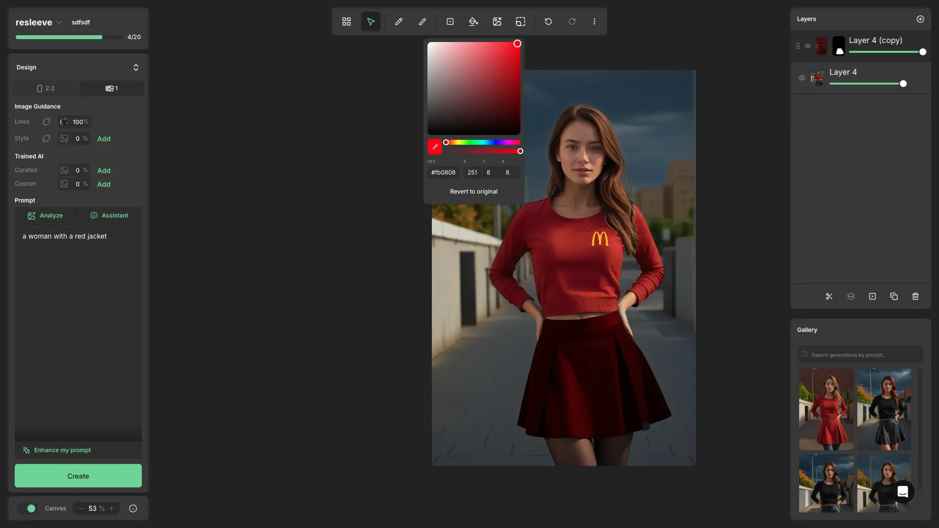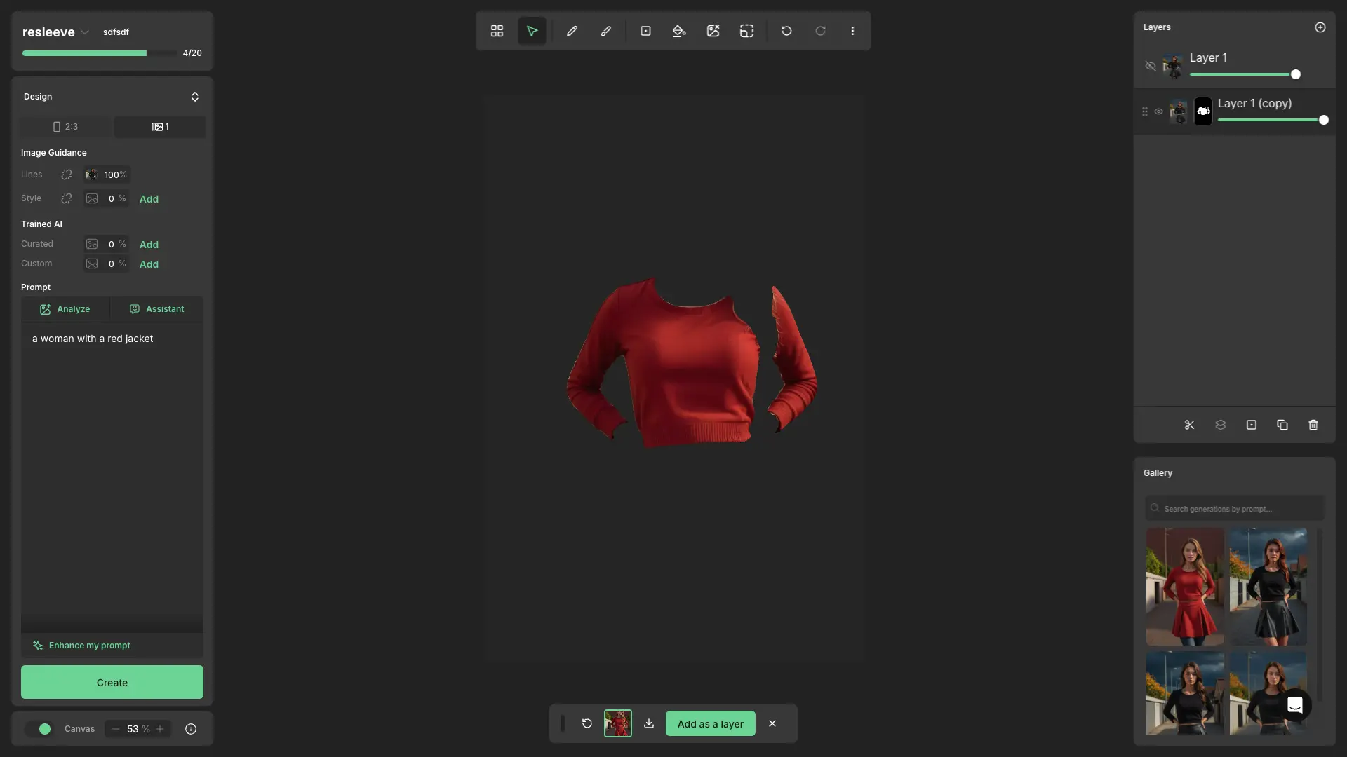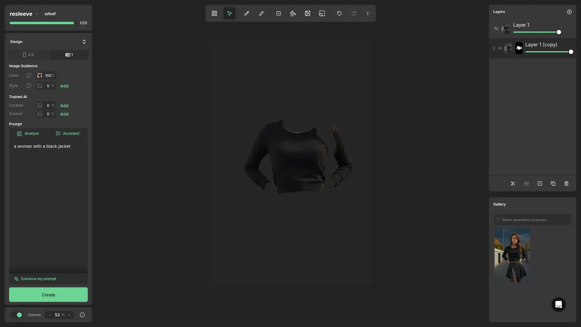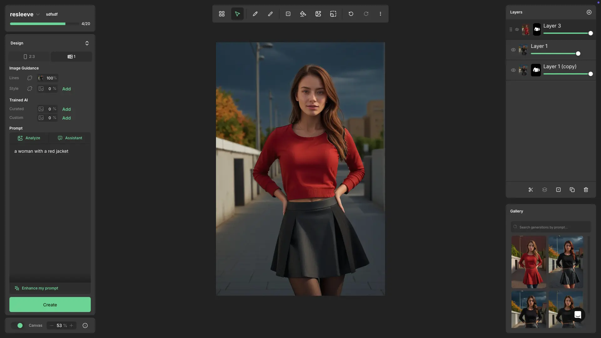 This is the core feature of Resleeve, an infinite canvas where you can generate images using AI. It also has integrated retouch tools, allowing you to edit images like inPhotoshop. You get layers, masks, drawing tools, image processing, and more.